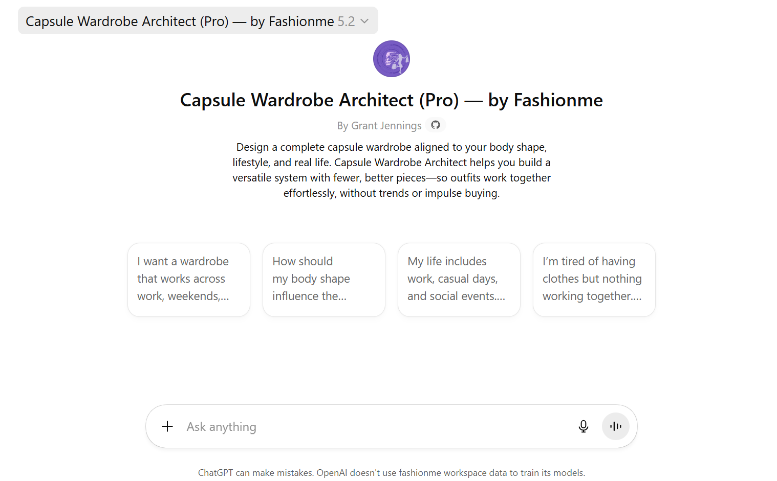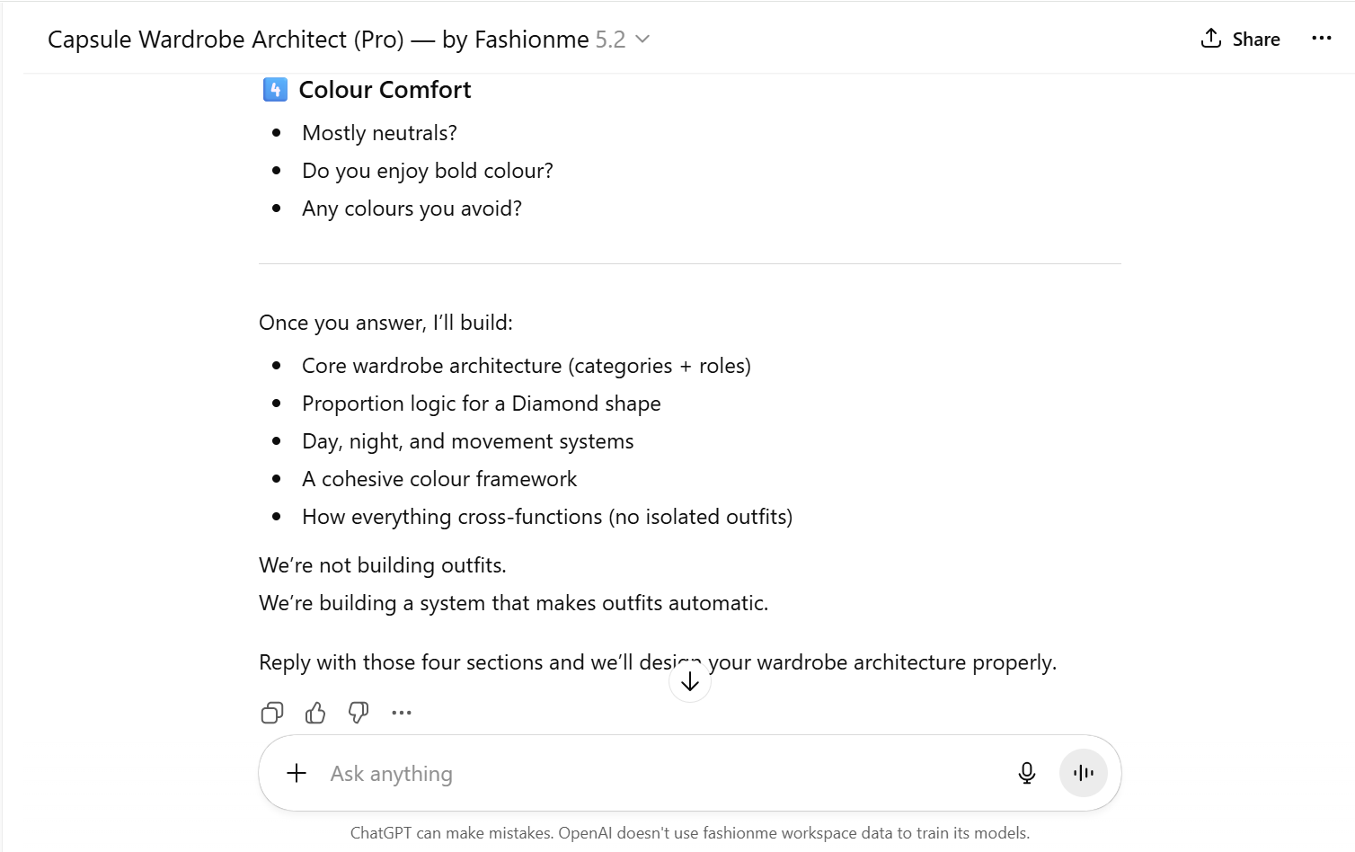 Those tools give generic advice. Fashionme builds a profile around your specific body shape, wardrobe, and lifestyle — and its suggestions get better over time. It's personalised fashion intelligence, not a chatbot.